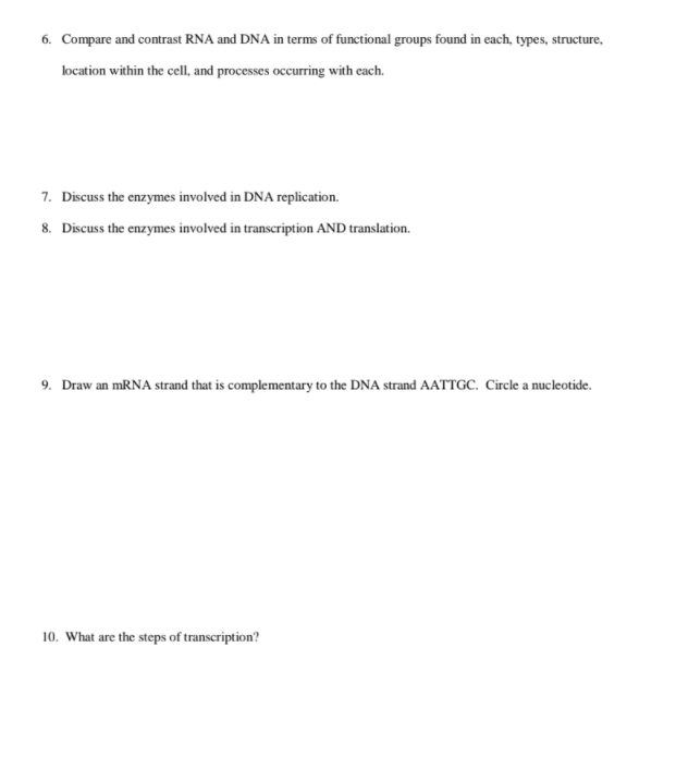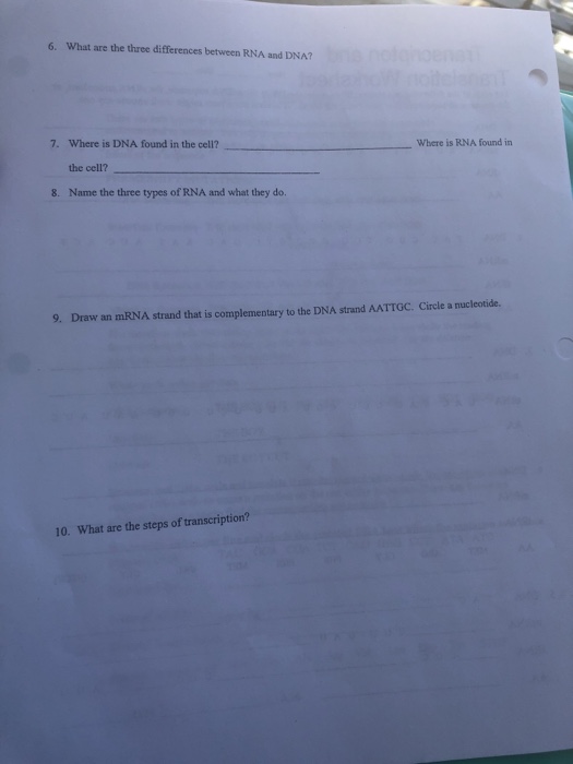 2 What are the steps of transcription. Draw a mrna strand that is complementary to the DNA strand aattgc circle the nucleotide. A name 3 types of RNA and whats theyre function.